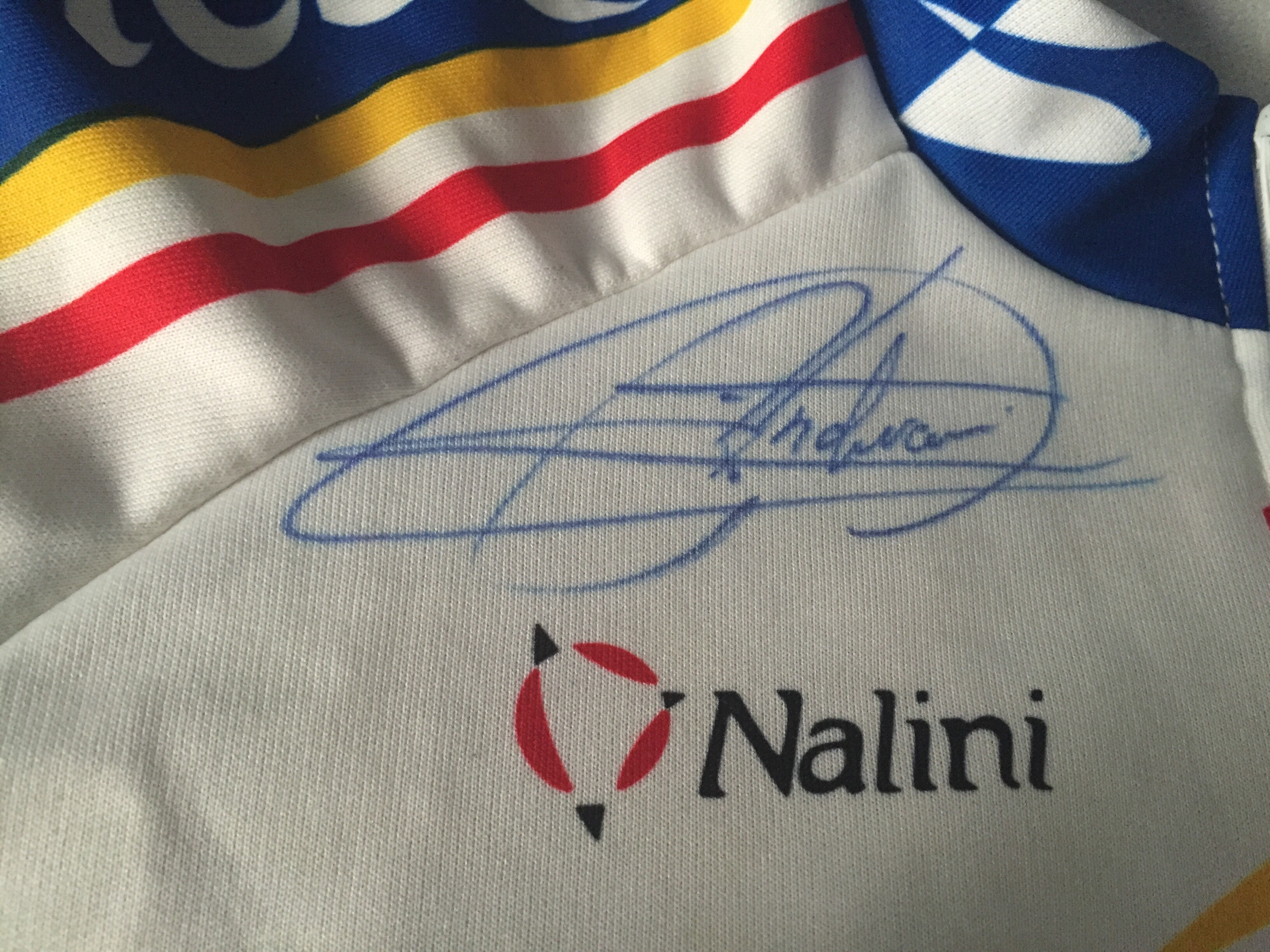 Mítico maillot NALINI CAMPAGNOLO usado y firmado por Miguel Indurain y su hermano Prudencio en el criterium de Zaragoza celebrado el 13-10-94 Conservado como una joya durante años. Especial para coleccionistas. Regalo todo tipo de revistas de la época con todos sus logros.
