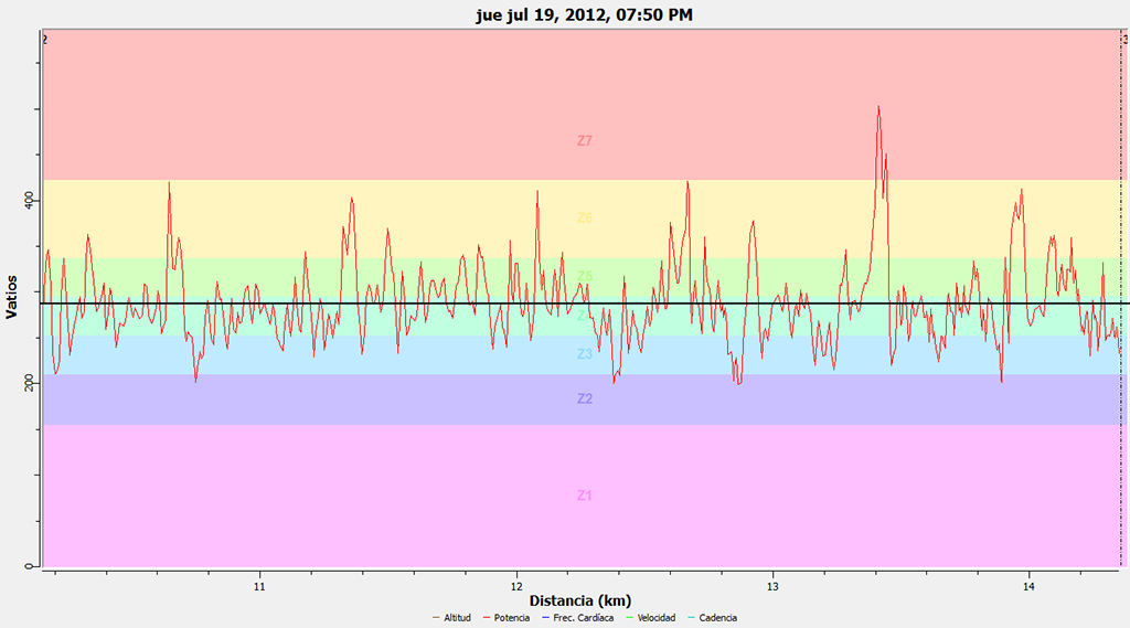 Bueno, me pasa en general. por ejemplo esto es una repetición subiendo la radio (por detrás) sin suavizado. Tengo la impresión de que ¿puede ser porque soy demasiado explosivo y por eso no puedo mantener un aporte constante? Pero mi perfil de potencia es de contrarreloj (ascendente desde el sprint) lo que tiraría por tierra está teoría. Peso 79 kgs y saco 300w en 20' ("¡Datos! ¡Datos!" Me recuerda a corto-circuito) :mrgreen:
