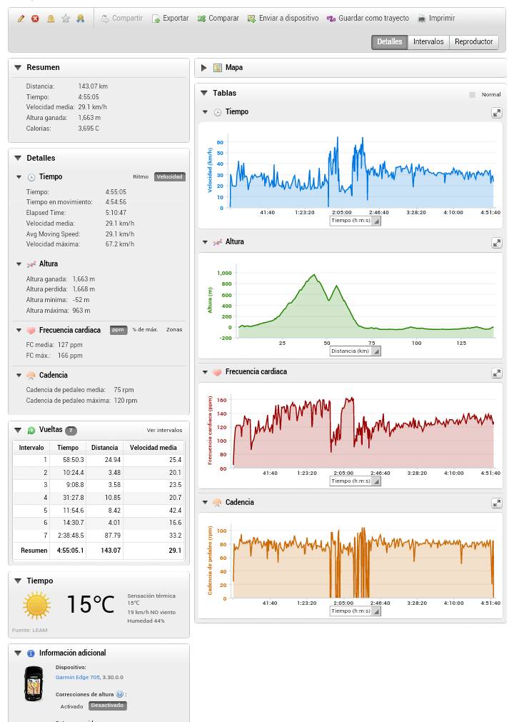 La semana pasada acumule unas 15h, entre semana 5h y el finde 10h, pongo la salida del domingo donde me mantuve en las subidas en z3 con tan solo unos 5' en z4 baja.