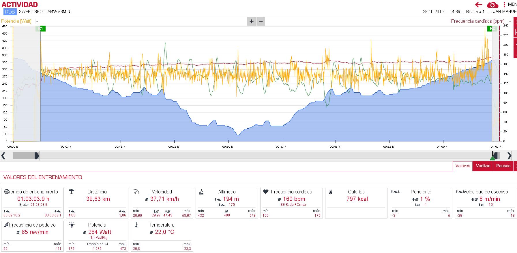 Ayer ss 284W con 160ppm, se me quedó en 63min porque los primeros 5minutos el cuentakilometros no me reconocía el powertap y no me marcaba...