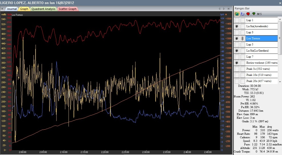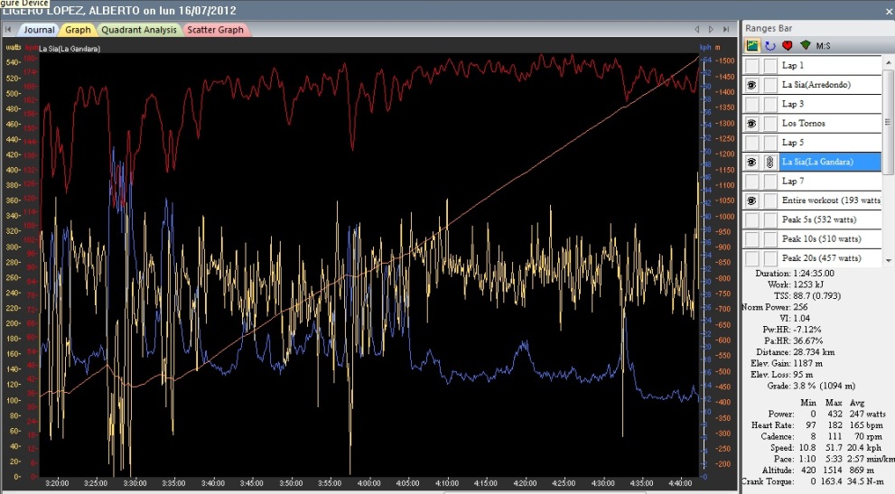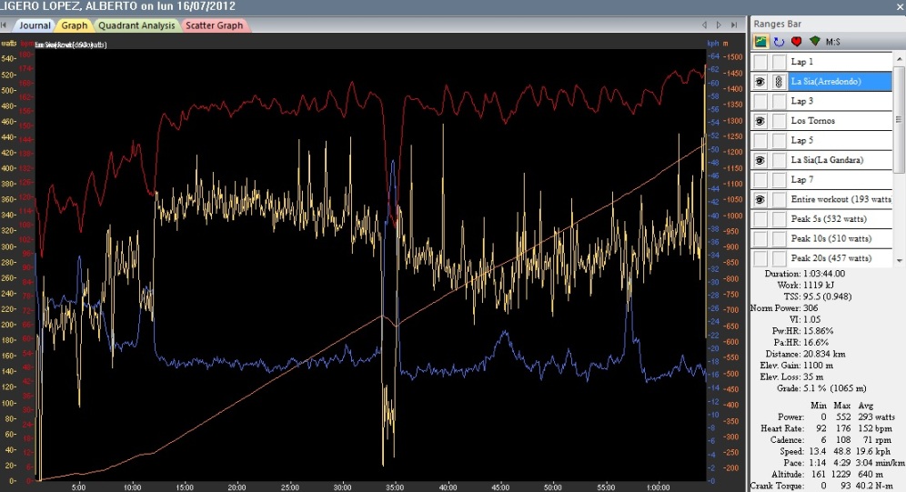 El lunes Hop o pseudohop más bien, lo hice en un puerto y se me quedó corto, 45' solo aunque compensa un poco la intensidad pero a pesar de ello salvo los primeros 10 minutos se me hizo muy llevadero. Luego a la vuelta unos sprint con 5' de recuperación (iba fundido y no pasaba de los 900W) y al final 4 horitas con casi 2000m de desnivel