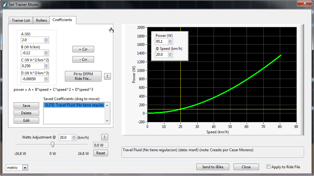 Al final, haciendo varias medidas (por ejemplo., 10,15,20,25,30,35,40,45) de velocidad y su potencia, con excel haces una gráfica y la adaptas a una curva polinomial de orden tres para sacar la fórmula de la velocida-potencia.