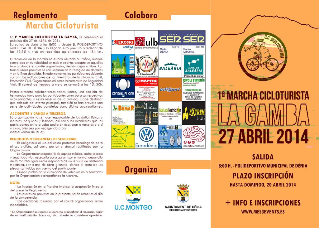 La Unión Ciclista Montgó y el Eximo Ayuntamiento de Dénia van a realizar la 1ª Marcha Cicloturista “La Gamba” que se celebrará el domingo día 27 de abril del 2014, dicha prueba se realizará por carreteras de la Provincia de Alicante constará de 134 km con un desnivel acumulado de 1810 m. El precio de inscripción será para ciclistas federados de 30€ y no federados 35€ (seguros incluidos) con este importe tendrán derecho a lo siguiente: