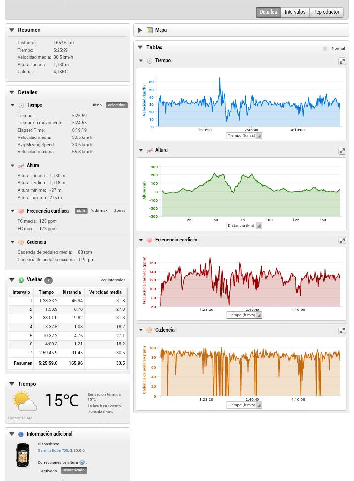 Hola, volviendo al tema de los entrenos, e adquirido un garmin egde 705 de un amigo, esta como nuevo ya que no le daba uso, el martes lo probé y vi que 3h de z2 a 130p me marcó casi 3700kcal, pues investigando por los foros ponia que inflaba un 35% las kcal, lo que hice fue restarle a mi peso (65kg) un 35%, pues bien le puse que pesaba 42kg y ya mas o menos me clava las kcal, hoy e salido con una grupeta pequeña de unos 6-7 ciclistas, e ido todo el camino tirando tanto a la ida como a la vuelta, e sacado 125pm y tan solo e tenido un calenton de poco más de 1 minuto, al final mucho sube y baja, unos 1000m de desnivel en 166km.