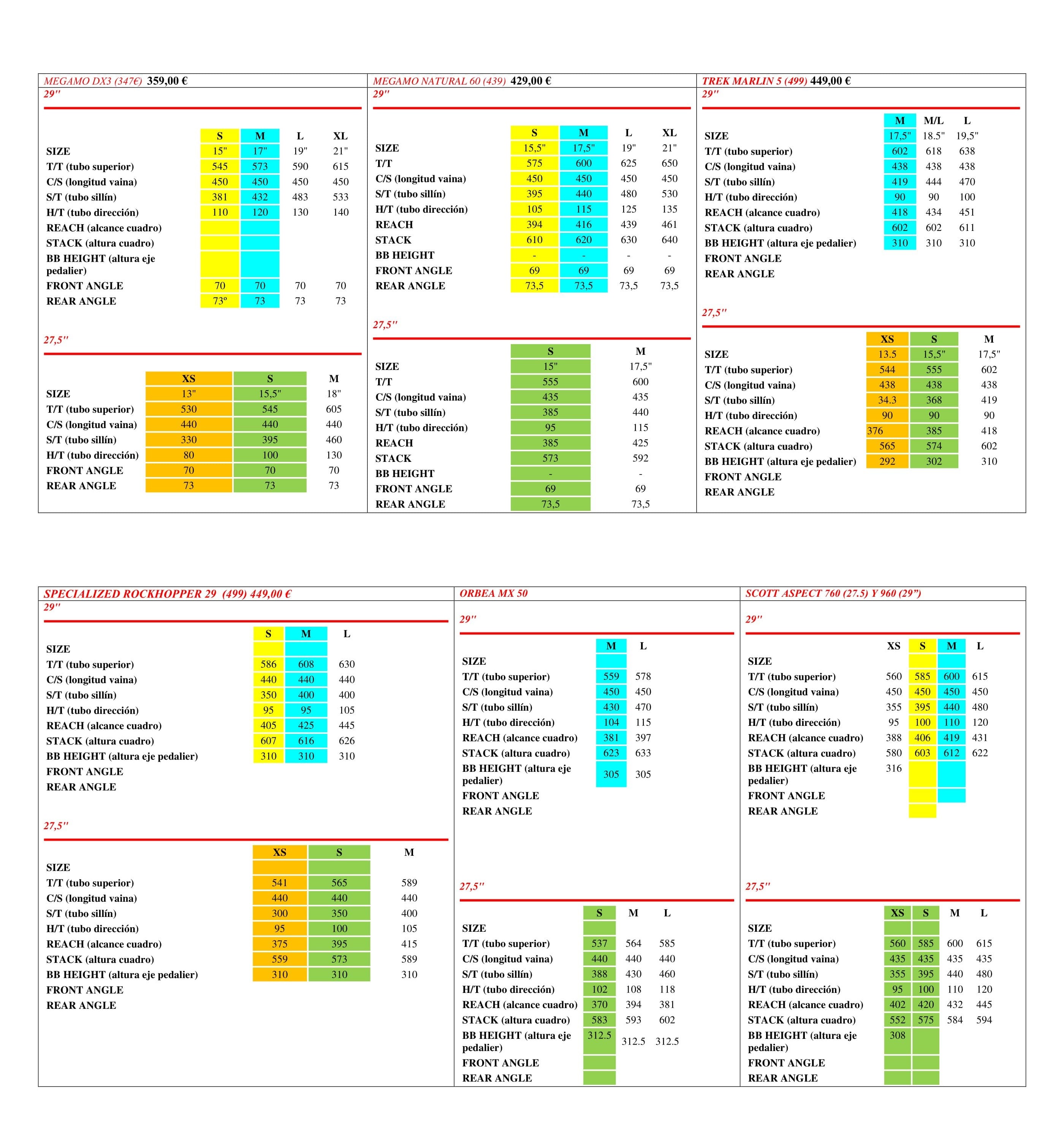 Estoy pensando en comprarme una bicicleta y tengo algunas vistas os voy a dejar una tabla con las tallas de las bicicletas y otra con los componentes. Suelo hacer pequeñas rutas de 20-50km normalmente en caminos