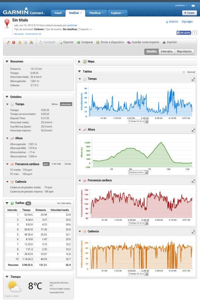 Ayer tenia que estar temprano en casa y disponia de unas 3h y salimos un colega y yo, toda la salida fuimos chupando viento de cara, habia momentos que en el llano iba en z3 a 24km/h,los dos fuimos apareados toda la salida y asi aprovechabamos esas 3h, estuve 30 en z4 baja y saque 162pm en la subida con bastante viento de cara.