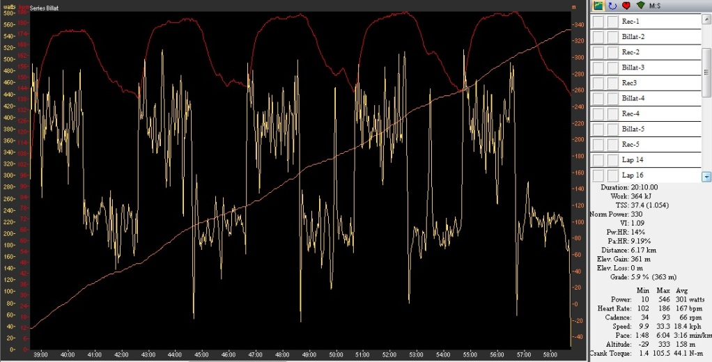 Hoy he hecho mi primer P6, se que podia haber dado mas, no es que no me haya esforzado sino que llevaba buff y al respirar me estorbaba, pero si me lo quitaba hacia demasiado frio ,la he hecho a tope y he llegado con los pulmones helados jeje 20w mas creo que is puedo sacar, al finla me han salido 402w con 68.5kg es decir 5.87w/kg.