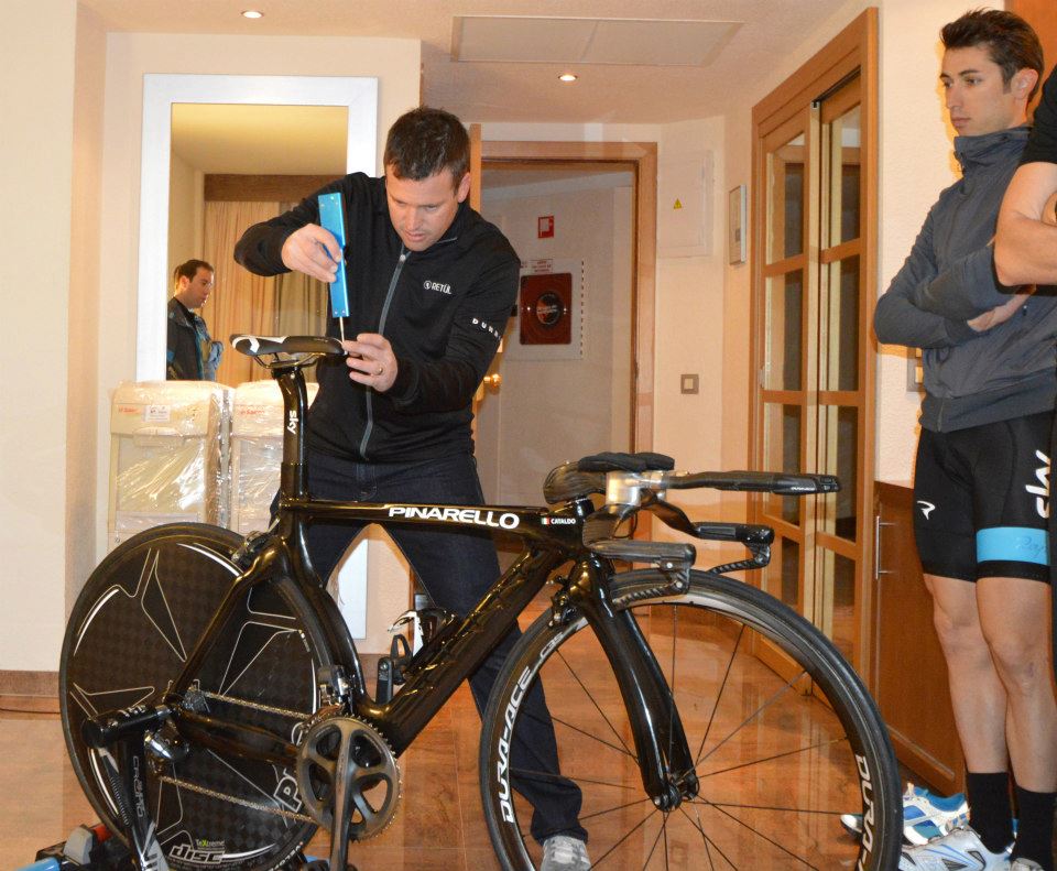 Este es un error que ya se comete en menos ocasiones, pero aún se ve a menudo. Aquí basta con el ya muy visto (aparece comúnmente en las web’s de “biomecánica” ciclista) sentarse en una mesa, manos (palmas hacia abajo, dedos mirándose) debajo de los muslos próximas a las rodillas. Las piernas colgando, los pies toman entonces su posición. En muchos casos los dedos apuntan hacia fuera, menos están paralelos y menos aún miran hacia adentro. Pues no hay más que trasladar ese pequeño ángulo a la posición de nuestra cala (una vez efectuadas las maniobras arriba indicadas).